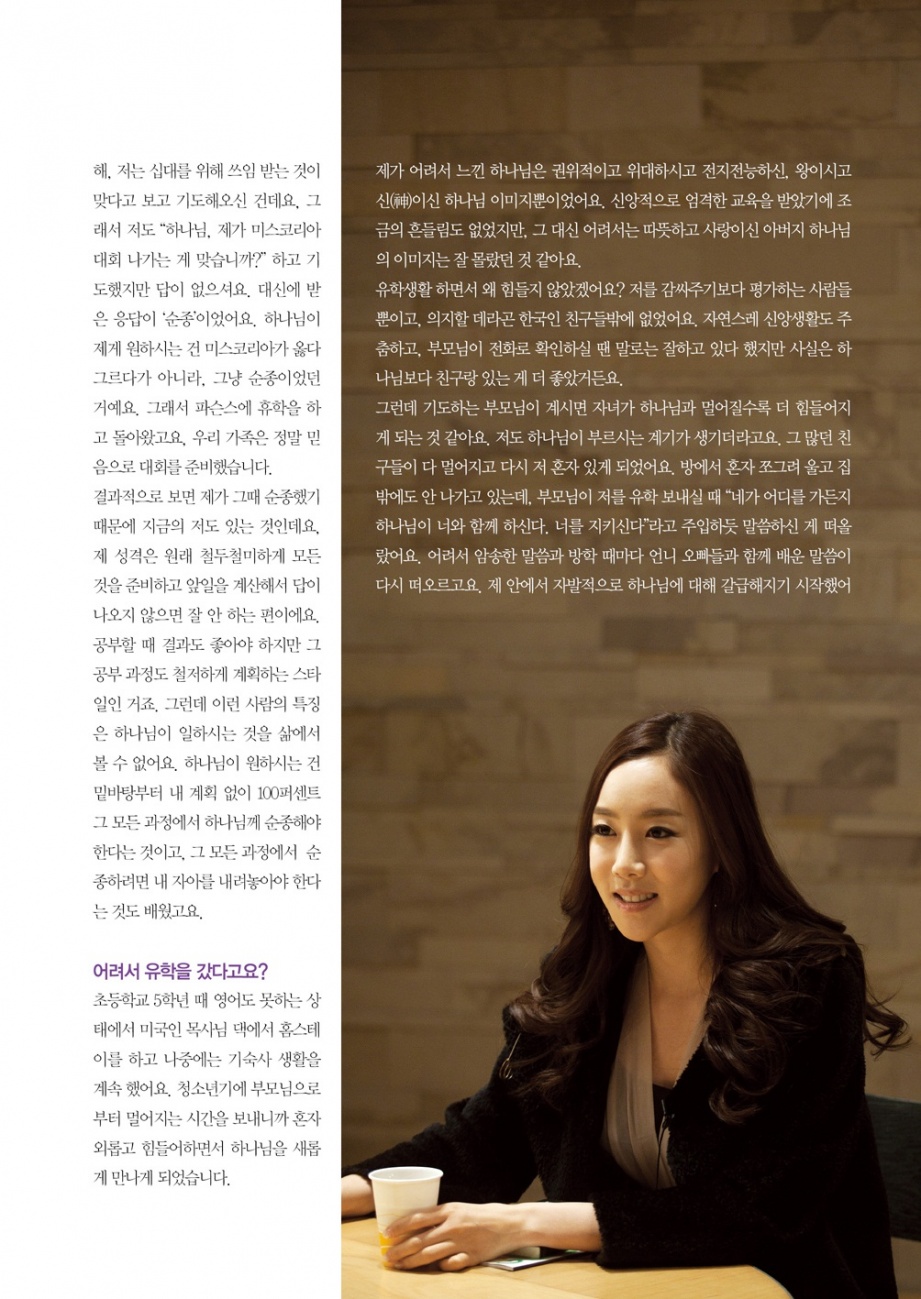 대부분의 부모님은 딸이 이런 대회 나가겠다면 찬성보다 반대를 하실 거예요. 하지만 제 부모님은 다르셨어요. 제가 4살적부터 미스코리아가 될 거라는 비전을 품고 기도해오셨거든요. 그때부터 아빠는 “너는 미스코리아가 되어 하나님께 영광을 돌려야 한다”고 수도 없이 말하셨어요. 그런데 저는 사실 미스코리아 나가고 싶은 마음이 전혀 없었거든요.