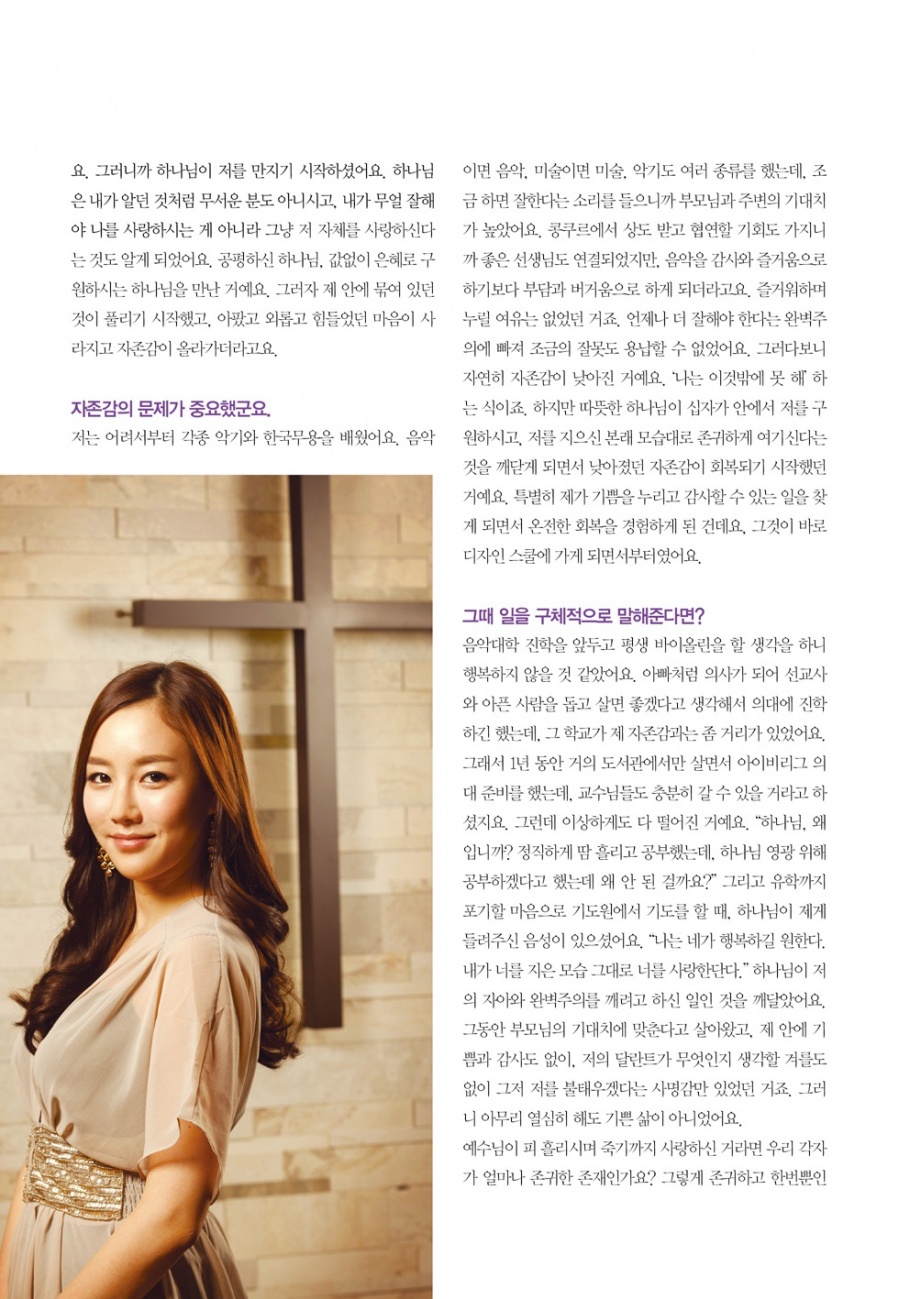 “내 안에 계신 나의 주님이 세상 무엇보다 아름다우시니까” 2011년 한국 대표 미인으로 뽑혀 2012년 미스유니버스대회 출전을 준비하고 있는 미스코리아 이성혜를 만나놓고 처음 내민 질문은 “부모님이 궁금해요”였다. 필자의 가벼운 필설(筆舌)로 ‘좀 특별한’ 한국 대표 미모(美貌)를 먼저 그려내자니 역부족이다 싶기도 하고, 작년 코스타 코리아의 무대에서 사회자가 ‘미스코리아의 아버지’라고 슬쩍 소개한 이선일 장로(울산 소망정형외과 원장, 코스타 강사)도, 그리고 이런 딸을 낳은 가문의 신앙 내력도 궁금하던 터였다. 아니 땐 굴뚝에서 푸른 연기 나겠는가? 월드휴먼브리지는 이성혜가 출석하는 만나교회가 설립한 국제구호단체. 이성혜는 미스코리아 상금 2천만 원 중 1천만 원을 말라리아 퇴치를 위해 기부했으며, 나머지 1천만 원은 아버지가 후원하는 청년들의 장학금으로 사용했다. 3월 16일에는 총리공관에서 김황식 국무총리가 주관한 여수세계박람회 후원기업 CEO 및 경제단체장 오찬간담회의 진행을 맡기도 했다. 부모님과 집안 이야기부터 들려주시죠. 부모님은 여기에 10년 넘게 시간과 물질을 드리고 계세요. 1년에 2번, 겨울과 여름에 각각 한 달씩 학생들을 모이게 해서 영성수련회와 선교여행을 하는데, 매일 아침 말씀 묵상하고 강의 듣고 성경토론회 하고, 또 전공 영역별로 어떻게 비전을 이뤄갈 수 있을지를 토론해요. 그렇게 훈련받은 청년들이 전 세계적으로 500여 명, 지금은 국내에만 100여 명이니 이제는 해외에 더 많이 나가 있는 거지요. 자라면서 어떻게 신앙교육을 받았습니까? 미스코리아 대회에 나간 계기는? 청년들, 특히 십대를 위해서 라면 이런 예능미디어에 속한 사람들의 영향력이 반드시 필요하다고 확신하신 거예요. 그래서 아빠는 청년들을 위해, 저는 십대를 위해 쓰임 받는 것이 맞다고 보고 기도해오신 건데요, 그래서 저도 “하나님, 제가 미스코리아 대회 나가는 게 맞습니까?” 하고 기도했지만 답이 없으셔요. 대신에 받은 응답이 ‘순종’이었어요. 하나님이 제게 원하시는 건 미스코리아가 옳다 그르다가 아니라, 그냥 순종이었던 거예요. 그래서 파슨스에 휴학을 하고 돌아왔고요, 우리 가족은 정말 믿음으로 대회를 준비했습니다. 결과적으로 보면 제가 그때 순종했기 때문에 지금의 저도 있는 것인데요, 어려서 유학을 갔다고요? 유학생활 하면서 왜 힘들지 않았겠어요? 저를 감싸주기보다 평가하는 사람들뿐이고, 의지할 데라곤 한국인 친구들밖에 없었어요. 자연스레 신앙생활도 주춤하고, 부모님이 전화로 확인하실 땐 말로는 잘하고 있다 했지만 사실은 하나님보다 친구랑 있는 게 더 좋았거든요. 그런데 기도하는 부모님이 계시면 자녀가 하나님과 멀어질수록 더 힘들어지게 되는 것 같아요. 저도 하나님이 부르시는 계기가 생기더라고요. 그 많던 친구들이 다 멀어지고 다시 저 혼자 있게 되었어요. 방에서 혼자 쪼그려 울고 집밖에도 안 나가고 있는데, 부모님이 저를 유학 보내실 때 “네가 어디를 가든지 하나님이 너와 함께 하신다. 너를 지키신다”라고 주입하듯 말씀하신 게 떠올랐어요. 어려서 암송한 말씀과 방학 때마다 언니 오빠들과 함께 배운 말씀이 다시 떠오르고요. 제 안에서 자발적으로 하나님에 대해 갈급해지기 시작했어요. 그러니까 하나님이 저를 만지기 시작하셨어요. 하나님은 내가 알던 것처럼 무서운 분도 아니시고, 내가 무얼 잘해야 나를 사랑하시는 게 아니라 그냥 저 자체를 사랑하신다는 것도 알게 되었어요. 공평하신 하나님, 값없이 은혜로 구원하시는 하나님을 만난 거예요. 그러자 제 안에 묶여 있던 것이 풀리기 시작했고, 아팠고 외롭고 힘들었던 마음이 사라지고 자존감이 올라가더라고요. 자존감의 문제가 중요했군요. 즐거워하며 누릴 여유는 없었던 거죠. 언제나 더 잘해야 한다는 완벽주의에 빠져 조금의 잘못도 용납할 수 없었어요. 그러다보니 자연히 자존감이 낮아진 거예요. ‘나는 이것밖에 못 해’ 하는 식이죠. 하지만 따뜻한 하나님이 십자가 안에서 저를 구원하시고, 저를 지으신 본래 모습대로 존귀하게 여기신다는 것을 깨닫게 되면서 낮아졌던 자존감이 회복되기 시작했던 거예요. 특별히 제가 기쁨을 누리고 감사할 수 있는 일을 찾게 되면서 온전한 회복을 경험하게 된 건데요, 그것이 바로 디자인 스쿨에 가게 되면서부터였어요. 그때 일을 구체적으로 말해준다면? 그동안 부모님의 기대치에 맞춘다고 살아왔고, 제 안에 기쁨과 감사도 없이, 저의 달란트가 무엇인지 생각할 겨를도 없이 그저 저를 불태우겠다는 사명감만 있었던 거죠. 그러니 아무리 열심히 해도 기쁜 삶이 아니었어요. 예수님이 피 흘리시며 죽기까지 사랑하신 거라면 우리 각자 얼마나 존귀한 존재인가요? 그렇게 존귀하고 한번뿐인 인생인데, 하나님이 원하시는 것이 제가 행복하게 사는 것이라면, 내가 이제는 무엇을 하며 살아야 할지를 새롭게 생각해보게 된 것이지요. “하나님, 제가 뭘 하면 좋을까요?” 하고 기도했어요. 그러자 제가 어려서부터 꾸미는 일을 좋아했다는 걸 보게 하셨어요. 그것도 저를 꾸미기보다 남을 꾸며