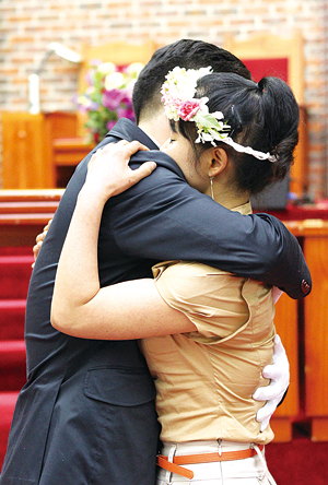 나름대로 보고 듣고 배운 것이 있어 자상한 남편, 좋은 아버지 흉내를 내고 살았다. 그러나 그 허상이 부부학교에서 가차 없이 무너졌다. 5월 19일 오후, 두란노 부부학교가 열리고 있는 과천교회로 발걸음을 향했다. 부부학교 첫 느낌은 생소했다. 그곳에 모인 남편과 아내가 마치 시합이라도 하듯 맞잡은 손을 절대로 놓지 않았다. 심지어 이들 부부들은 이동할 때에도 두 손을 꼭 잡고 있었다. 여기에는 70대 어르신부터 신혼의 단꿈을 꾸고 있는 젊은 부부에 이르기까지 예외가 없다. 마치 수십 년간 이산가족으로 있다가 상봉한 부부가 다시는 떨어지지 않으려는 몸부림처럼 보이기도 했다. “주님 우리가 부부입니다. 부부가 함께 하면 가정이 하나 된다.” 이 짧은 구호는 단순하지만 부부학교의 모든 내용을 함축하고 있었다. 이날 32쌍의 부부들은 참된 가정이 무엇인지 그리고 하나님이 원하시는 부부는 무엇인지 강의와 토론을 통해 배워 나갔다. 약방의 감초라고 했나? 부부학교에서 빠질 수 없는 것이 있다. 부부가 손을 맞잡고 서로의 눈을 응시하면서 사랑을 고백하는 시간. “미안해요. 사랑해요. 고마워요. 여보, 당신을 축복합니다.” 그리고 이어지는 뜨거운 포옹. 과천 부부학교 권충성 팀장은 “이것만 잘해도 가정이 행복해 진다”고 했다. 그러고 보니 아내의 눈을 바라보며 이야기를 해봤던 기억이 가물가물 해진다. 신혼 때 이후로 ‘고맙다 사랑한다’는 말을 해본 적이 있나? 부부학교에서는 호칭 하나도 마음대로 못쓰게 했다. 우리는 흔히 ‘00아빠, 00엄마, 오빠’라는 이름에 익숙해져 있다. 그러나 부부학교에서는 이름을 부르게 했다. 00아빠(엄마)라는 호칭은 자녀 중심의 삶을 의미한다. 자녀를 위해서라면 부부의 관계마저 끊어버리는 한국인의 특성을 부부학교가 제대로 본 것이다. 그래서 자녀에게 밀린 남편과 아내의 우선순위를 회복시킨다는 뜻에서 이름을 부른다. 사랑의 언어와 포옹, 호칭 변경이 지나친 강요라는 지적도 있다. 그러나 억지로라도 연습을 해야 하는 것이 우리의 현실이다. 5월 21일 부부의 날을 맞아 서울시가 내놓은 통계에 따르면, 결혼생활 20년 이상 된 ‘베테랑 커플’의 황혼이혼이 1991년 978건에서 2011년 5704건으로 5배 이상 증가했다. 또한 4월 통계청이 발표한 ‘2011년 혼인·이혼 통계’에 따르면 인구 1000명당 4.7명이 이혼한 것으로 나타나 여전히 세계 최고 수준의 이혼율을 보이고 있는 상황이다. 천국이어야 할 가정이 절망의 늪으로 변한 현실을 본다면 부부학교의 ‘억지’가 필요하다. 5주간의 짧은 시간에 변하기 어렵다는 지적도 있다. 맞는 말일 수도 있다. 수십 년 동안 쌓아온 벽을 한순간에 허물기란 불가능해 보인다. 그러나 틀림이 아닌 다름을 인정하고, 네 탓이 아닌 내 탓임을 깨닫는 것만으로도 성공한 것이다. 5조 김성식·전용희 부부는 “교회에서는 잉꼬부부로 소문이 나 있었지만 10년 넘게 보이지 않는 벽이 있었다”면서 “이제부터 하나씩 풀어나갈 예정”이라고 다짐했다. 1조 성용재·김주현 부부는 “지난 27년 동안 자녀를 우선순위에 뒀었다”면서 “이제는 서로를 바라보며 살아가겠다. 무장해제 된 느낌이며, 신혼을 다시 찾은 것 같다”고 말했다. 부부학교는 ‘사랑의 언약식’으로 피날레를 장식했다. 하나님이 맺어주신 부부의 관계를 아름답게 이어가겠다는 다짐이 줄을 이었다. 그리고 언약식을 집례한 과천교회 주현신 목사의 당부가 며칠이 지나도록 기자의 귓가에 맴돌고 있다. “한손에는 예수 그리스도의 손을 잡고 한손에는 배우자의 손을 잡고 세상의 험한 파도를 이겨 내십시오. 서로 복종하고 서로 돕는 배필이 되십시오.” 누가 그랬다. 부러우면 지는 거라고. 그런데 그들의 진한 사랑이 부럽다. 이참에 부부학교에 등록해야겠다.