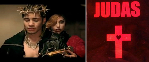 ▲레이디 가가의 앨범 수록곡인 ‘Judas’ 뮤직 비디오의 한 장면과 싱글 앨범 표지. |