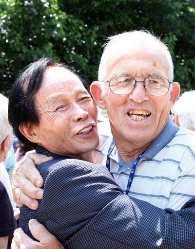 ▲ 직업학교에서 자신이 가르쳤던 학생을 60년 만에 다시 만나 포옹하고 있는 선교사의 얼굴에 기쁨과 반가움이 가득하다.