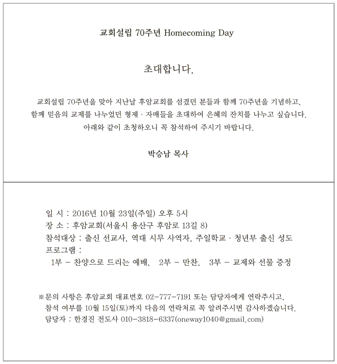 교회설립 70주년 홈커밍 데이 초청장
